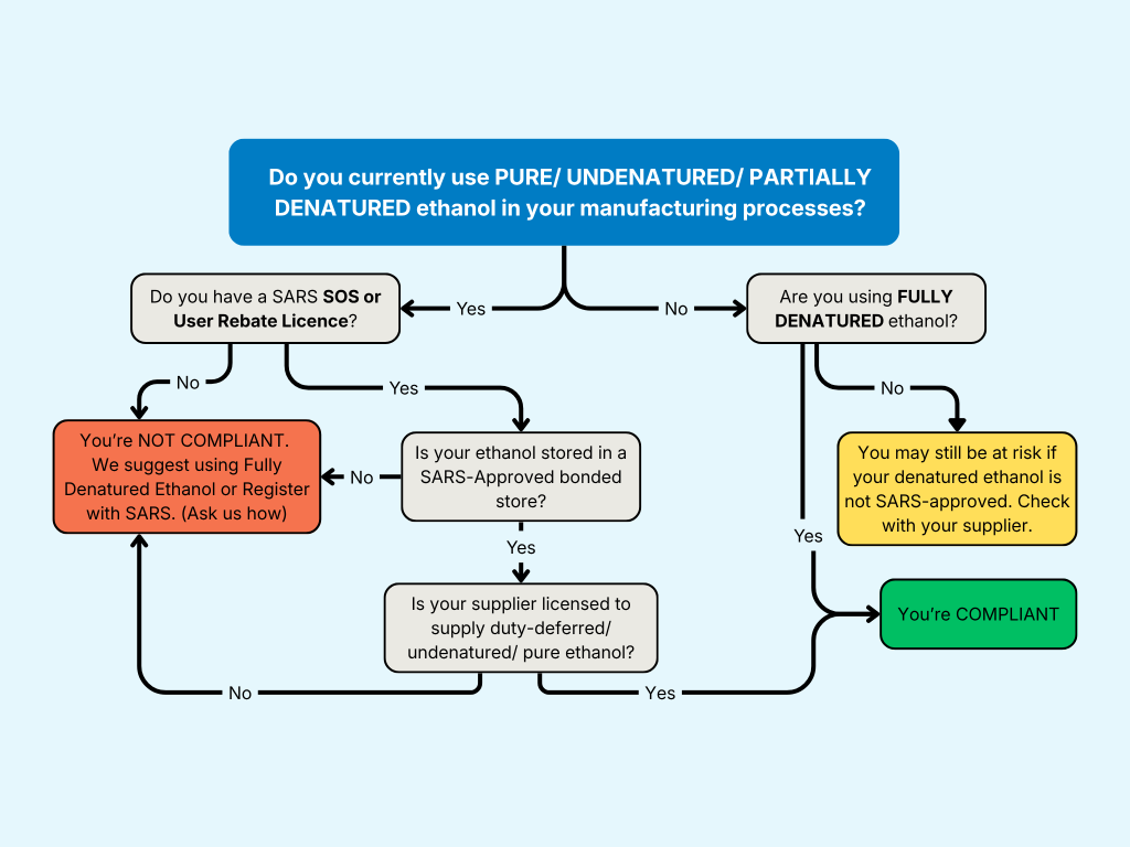 - Is the company is audited by SARS and cannot prove licensed end-use (i.e they do not hold a SARS SOS or User Rebate licence), the pure alcohol will be treated as excisable drinking alcohol